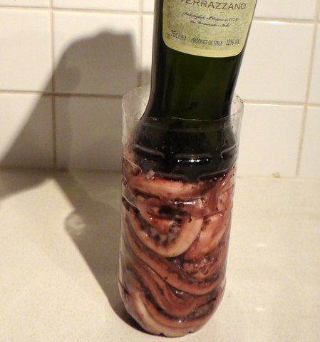 Use a wine bottle or something else (that you cleaned first) to push down on the octopus in the plastic bottle.