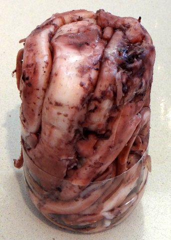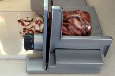 Octopus can be very tough and bland, but when you cook it sous-vide it will be tender and flavorful. I wrote about sous-vide octopus (Insalata di Polpo) before, but since octopus sous-vide is so good and I saw a nice idea on GialloZafferano that enables you to slice the octopus more thinly, I decided to write about it some more. The photos on GZ suggest that you can actually get slices of octopus ‘sausage’, but since there is no ‘glue’ to hold them together that doesn’t happen and the slices fall apart. It still looks great, and the thin slices make the octopus even more tender. It would be nice to think of something to make them stick together, because it would look even nicer that way.
