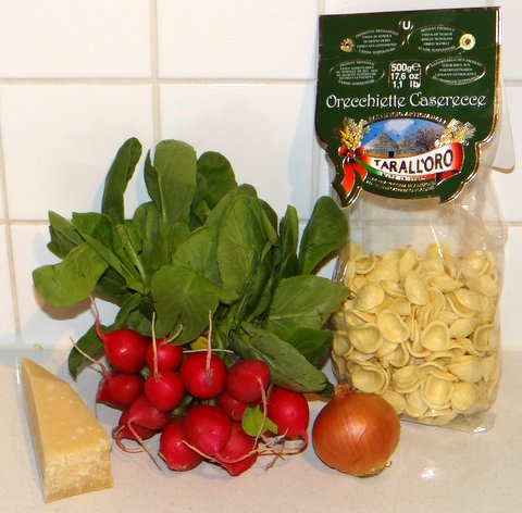 I was at the supermarket deliberating what I was going to make for dinner and noticed a bunch of radishes. I don’t eat many radishes and when I do, I usually eat them raw. But I remembered reading somewhere on a blog (don’t remember which one, might have been Emmy’s) that you can also eat the leaves and so I decided to make pasta with radishes. I turned out quite nice and was definitely something different. Cooking takes the edge off the radishes sharp taste. I might add pancetta next time or something else to complete the taste profile, but this was nice as it is. Although I’ve never seen this in Italy it is Italian-style at its best: ready in the time it takes to cook the pasta, simple, healthy and tasty.