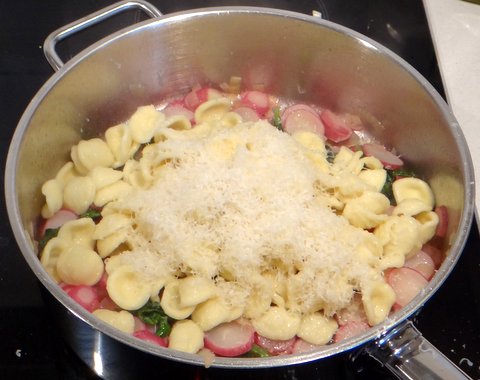 Add the pasta, a bit of the cooking water and freshly grated parmigiano to taste.
