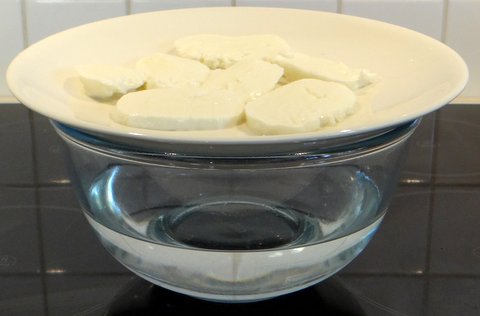 Slice the mozzarella into slices of about 1/2 cm (1/4 inch). Mozzarella is often served too cold, so you hardly taste anything. Put the slices of mozzarella on a plate, and put the plate on a bowl of hot water for a few minutes. This will soften the mozzarella and bring out the flavor. It will even work with cheap mozzarella.