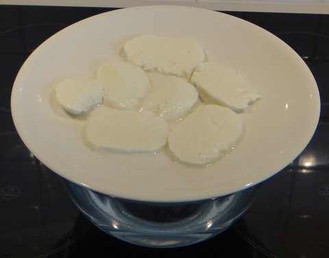 After a few minutes, a milky fluid will leak out of the mozzarella. It is now ready to be served.