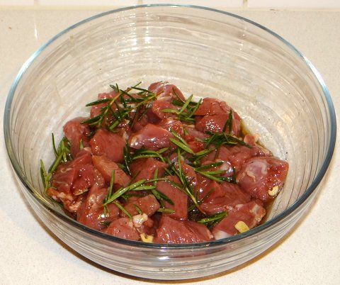 Put the meat in a bowl with garlic, rosemary, marsala, extra virgin olive oil, balsamic vinegar, salt, and freshly ground black pepper. Toss to mix. I never use exact amounts for this, but do what feels right. This means using more marsala than balsamic and not using too much garlic.