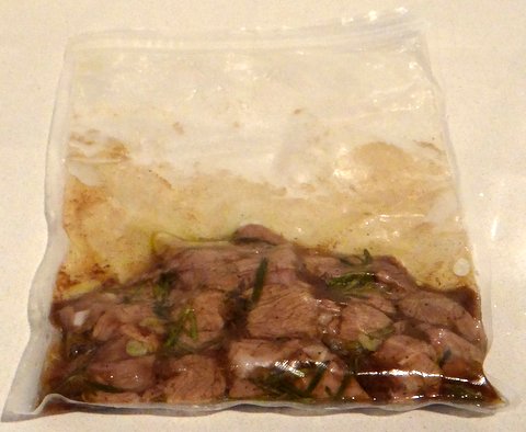 If you do have sous-vide equipment, there is no need to let it marinate and you can just cook it sous-vide straight away. Put the meat with the marinade in a ziploc pouch and remove most of the air by submerging it and sealing tight. Now cook sous-vide for 1 hour at 39C/102F, 1 hour at 49C/120F and 2 hours at 57C/135F. The first two hours are for ‘warm aging‘ the meat and will make it very tender. You can BBQ the meat right after it comes out the sous-vide (let it cool slightly to prevent overcooking) or cool the bag in ice water and refrigerate until the coals are hot.