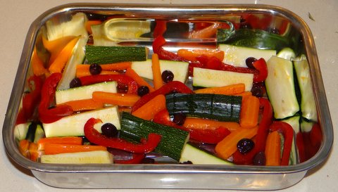 Drizzle some olive oil in a baking dish and spread out the vegetables in a single layer. Season with salt and freshly ground black pepper and drizzle with some more olive oil.