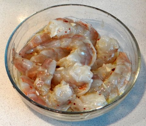 Marinate the shrimp with olive oil, red pepper flakes, minced garlic and salt to taste.