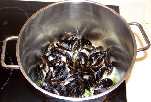 Rinse the mussels in cold water. Discard any mussels that remain open. Put 1 chopped onion and the white wine in a pot, add the mussels to pot. Cover with a lid and put on high heat until the mussels are open. Don’t cook longer than necessary, because that will make the mussels tough.