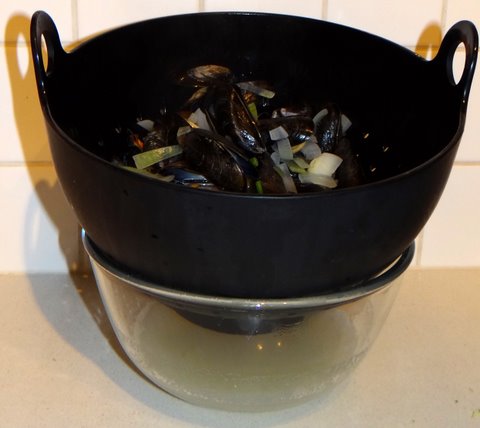 Drain the mussels and catch the liquid. Take the mussels out of the shells, reserving 12-16 nice-looking mussels for decoration.