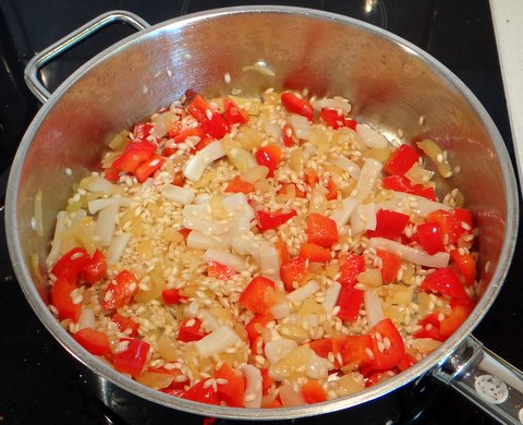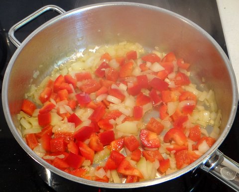 Heat the oil in a frying pan. Sauté the remaining onion with the red pepper until the onion is translucent.