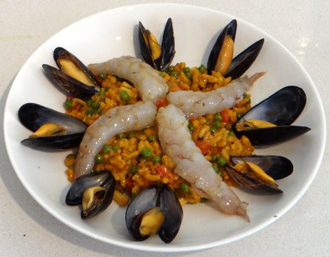 Arrange the paella on single oven-proof plates with the jumbo shrimp on top and the mussels in the shell on the side. Bake for 10-15 minutes in the oven until the shrimp are barely cooked.