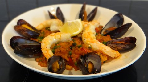 Paella is probably the most famous Spanish dish. There are different versions of paella, many of them containing meat such as chicken, rabbit and chorizo, as well as seafood. My version is seafood-only. Paella is traditionally made in a special paella pan, but I like to serve it on individual plates. Like many stock-based dishes, the taste of the paella depends on the quality of the stock. So it definitely pays off to make your own stock!
