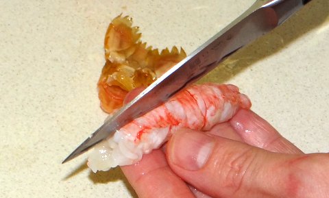 We end with scampi nigiri. Peel the scampi. Wash under cold water and pat dry with paper towels.