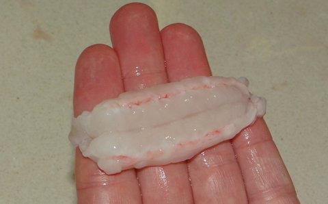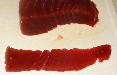 The second type is tuna nigiri. Cut the tuna crosswise in slices about 1/2 cm (1/4 inch) thick. Trim to make nice rectangular slices and keep the trimmings for making tuna maki later. Use the nices part of the tuna steak for the nigiri, making 8 slices.
