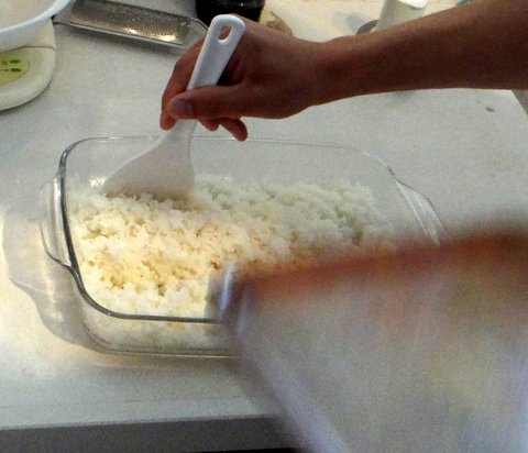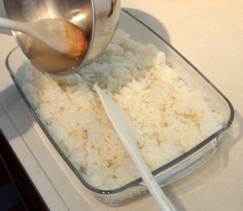 Spread out the rice in a large shallow container such as a lasagna dish (or use a proper Japanese hangiri tub if you own one…). Pour the dressing on the rice.