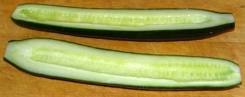 Wash and dry the outside of the cucumber. Halve lengthwise and scoop out the seeds with a spoon.