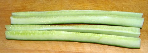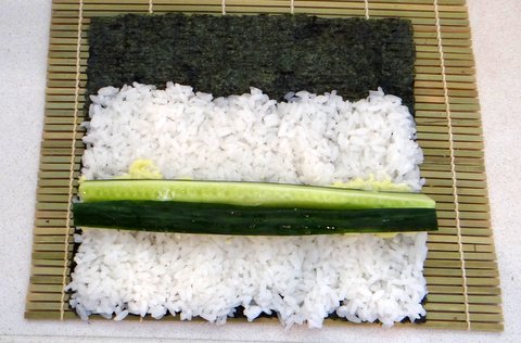 Trim the cucumber strips to the same size as the nori.