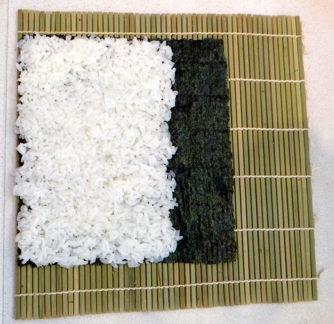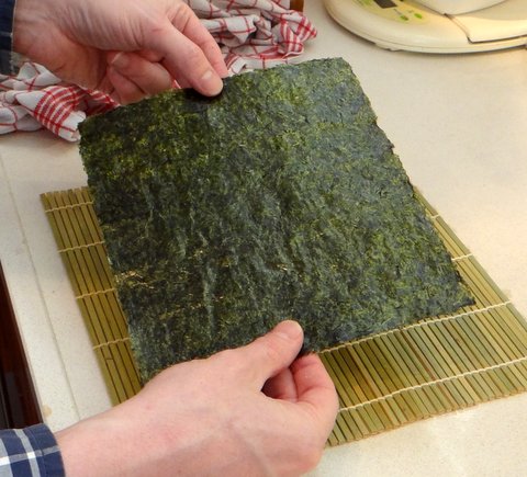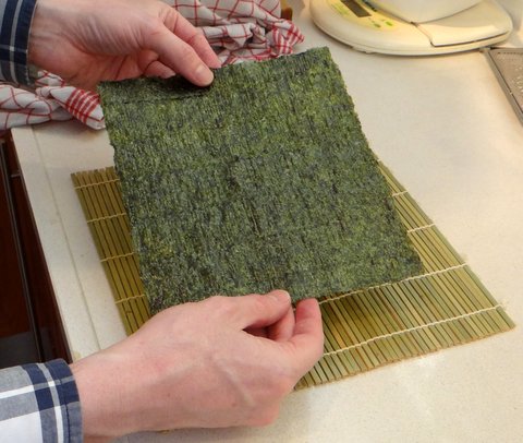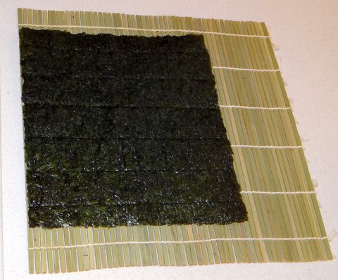 First make sure that the bamboo mat has the flat side up and the round side down. Put the nori on the bamboo mat with the shiny side down and the perforation in the same direction as the threads that hold the bamboo mat together.