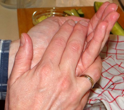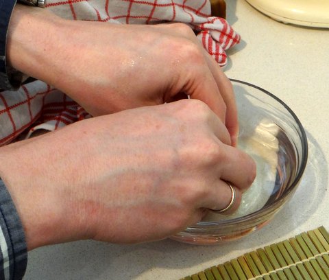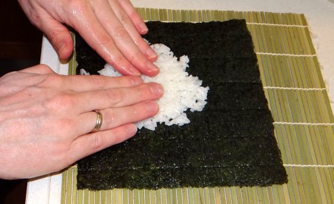 Put some water and rice vinegar in a bowl, and wet your fingers with this “hand vinegar”. Keep wetting your fingers in this bowl when needed, otherwise the rice sticking to your fingers will drive you crazy. Don’t make your fingers too wet, because the nori should not become wet (you will find out why when that does happen: it will wrinkle and become mushy).