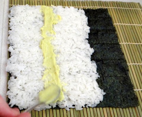 Put a line of the wasabi-mayonnaise on the middle of the rice.