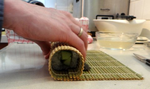 When you have rolled up the nori completely, press lightly on the roll to close it. Roll it another quarter and repeat.