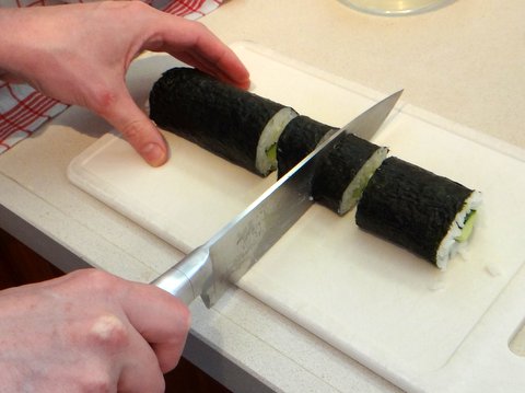 Cut the bad-looking ends off the maki. Use a sharp knife and wet it with the vinegar water to prevent the sushi from sticking too much to the knife. Cut the roll into halves, the halves into quarters and the quarters into eights to obtain 8 pieces of sushi with an even thickness.