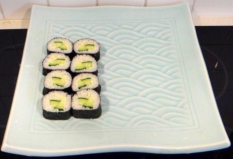 Arrange the pieces of sushi on a nice plate and continue with a second roll of cucumber maki.