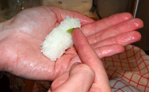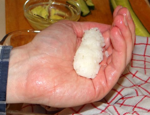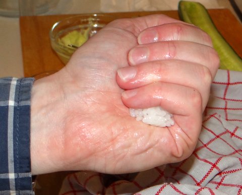 Making sure your hand and fingers are properly wet with vinegar water, take some rice about the size of a thick finger.
