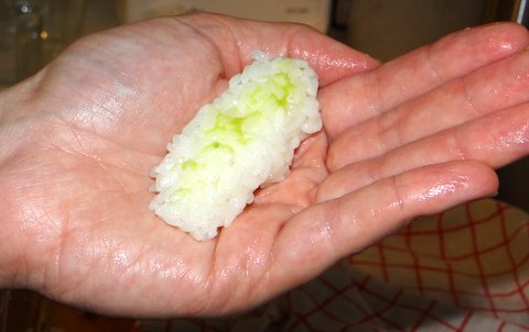 Press the rice into shape, making sure that it will stick together but do not mash it.