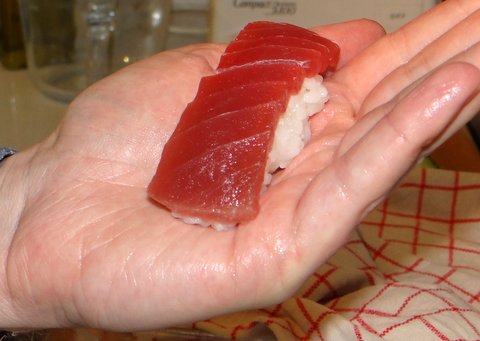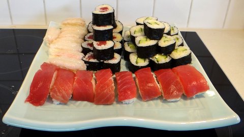 Making sushi together is a lot of fun, and although the sushi will probably not be as good as sushi at a specialized sushi restaurant, home-made sushi will taste much better than ready-made refrigerated sushi. It is not a coincidence that I like Japanese food besides Italian, as both rely to a great extent on the quality of the ingredients. This also applies to sushi: the quality of the rice, nori seaweed, wasabi, soy sauce, pickled ginger, and last but certainly not least the fish all make a difference. Your skill will define how the sushi will look, but the taste will to a great extent depend on getting the right stuff. And thus it pays off to go to a specialized store to obtain the ingredients, rather than picking them up from the local supermarket. Always tell your fishmonger that you will eat the fish raw, so that he can advise which fish is the fresh enough to eat raw.