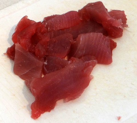 Trim the remaining tuna of any sinew and other nasty parts.