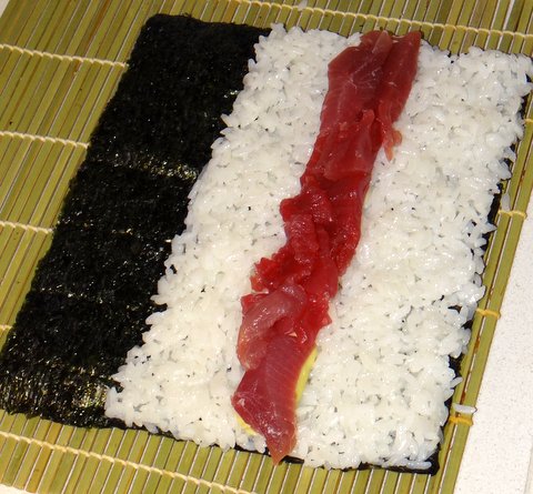 For the third type of sushi, you can now make two maki with the remaining tuna in the same way as the cucumber maki.