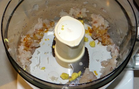 Put 6 of the shrimp with 1 tsp soy sauce and 1 tsp ginger into the food processor.