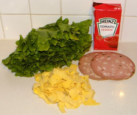 Endive (andijvie) is a very Dutch vegetable that he used for our primo: tagliatelle with mortadella and endive. This is what it looked like at the restaurant. This is only a half portion as it was served as part of a four-course menu. I liked the combination and decided to try making my own version. I didn’t use parsley because it was raining way too hard when I was making this to go into the garden to pick some, I used parmigiano rather than pecorino, and I used fresh home-made tagliatelle rather than dried tagliatelle, but other than that it tasted just as good. It’s very easy to make, and cheap as well. If you can’t find endive, substitute with radicchio or another vegetable with bitter leaves.
