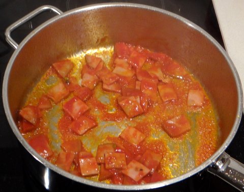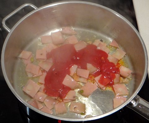Sauté briefly until the mortadella is coated with tomato, less than 1 minute.