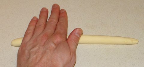 Take a small piece of dough and roll it with your hands to obtain a long cylinder as thin as a pencil. If your cylinder is thicker, your orechiette will also end up being thick.
