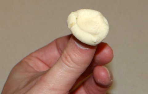 Next put the flattened piece of dough on your other thumb with the hollow side up.