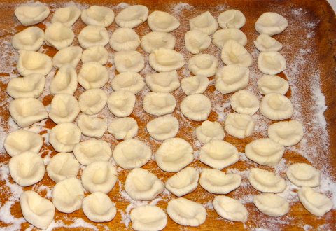 The ‘official’ way to make gnocchi by hand is by making a complicated movement with a rounded knife. Italian women learn this kind of thing from a young age from their (grand)mother, when all the women gather around a table in the kitchen to make pasta by hand. I used my thumb which is easier, but if you want you can try doing it the official way. This video shows you how. The video is not called “gesti dimenticati” (forgotten gestures) for nothing, since not many people still make orechiette this way. I love that you can tell that many orecchiette must have been made on this very table.