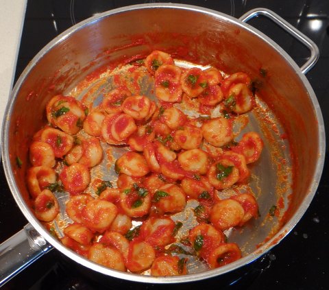 Drain the orecchiette and add them to the sauce, together with some fresh basil.