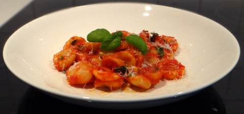 Orecchiette are often served just simply with a fresh tomato sauce, so that’s what I did to try my first batch of home-made orechiette. Home-made orechiette should dry a bit before you boil them, so make them some hours before or even the day before.