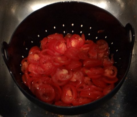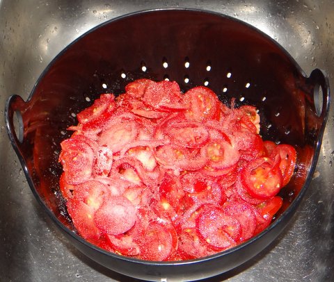 Put the tomatoes in a colander and sprinkle with about 1 Tbsp of salt.