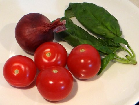 It is difficult to find tasty tomatoes in many countries, because tomatoes have been ‘optimized’ for shelf life, having an unblemished skin, growing quickly, ripening evenly, etc. rather than for taste. I always use the aptly named ‘tasty toms’ tomatoes for this salad. I further enhance the flavor by salting the tomatoes and getting rid of excess water. The added advantage of using this type of tomatoes is that they are small and thus fit into the feeding shaft of my food processor, making it a lot easier to slice dozens of tomatoes.