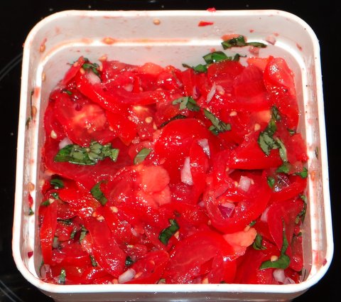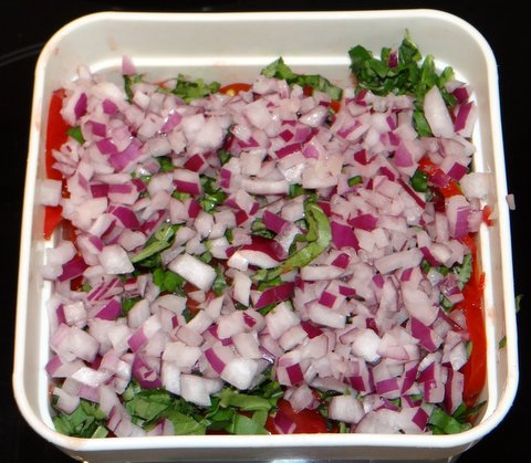 This is my version of the tomato salad that my friend Esther always used to make. Unfortunately she passed away much too young. Today would have been her 14th wedding anniversary, so I thought it an appropriate day to tell you about this recipe in her memory.
