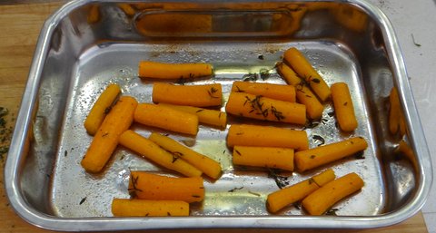Preheat oven to 225C/425F. Peel the carrots and cut into chunk. Toss in a baking dish with olive oil, salt, freshly ground pepper, and 1 Tbsp thyme.