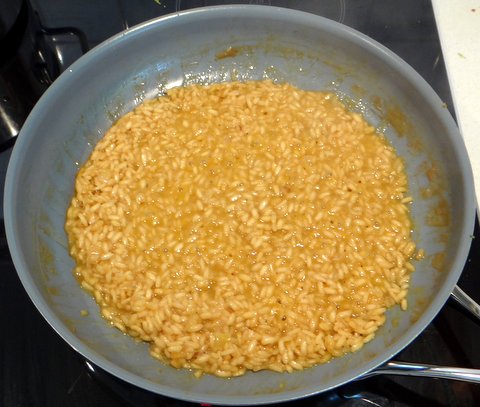Add the carrots to the risotto and stir, cook for a minute longer.