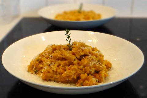 I’ve enjoyed cooking for a long time, but since I started blogging about it I’ve been experimenting and trying new things much more often than before. One of the big drivers of this is that other bloggers inspire me. One of the blogs that I get a lot of inspiration from is 35aweek.com. She posts a lot of things that sound and look delicious that I’ve never cooked before. One of those dishes was Roasted carrot & thyme risotto. Carrots are one of those vegetables that are healthy, cheap, and readily available, but can be a bit boring. So I liked the idea of using it for risotto, also because it was listed as a substitute for pumpkin. I’ve made pumpkin risotto before, but pumpkin is often a bit bland, more expensive and more work. Here’s my version.