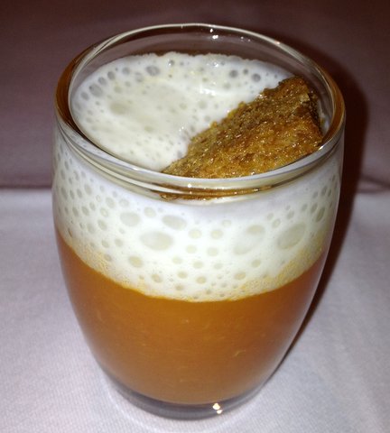 Amuse: cold tomato and nectarine soup with parmigiano cheese foam and a crostino. Very good flavor and contrast in structures. The prosecco we had as an aperitif was good.