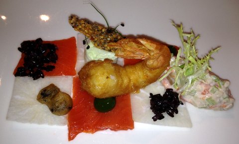 Carpaccio of sockeye salmon and daikon with jumbo shrimp tempura, olive tempura, wild rice, and a salad of sockeye salmon, carrot and celeriac. Very nice taste and textures and adequate pairing with a soave from Suavia. 8/10