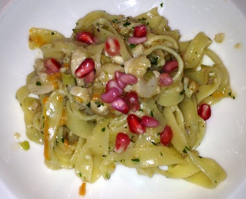 Fresh tagliatelle with a ragù of rabbit and pomegranate. Outstanding pasta dish with very tender flavorful rabbit and a fresh touch from the pomegranate and celery. We first got a red wine with this, a petit rouge from Valle d’Aosta called Enfer. Although this is a good wine and relatively light for a red, we still thought it was too strong for the rabbit. This was resolved immediately by replacing it with a white. 9/10