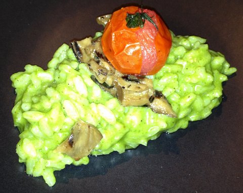 Pesto risotto with grilled eggplant and roasted cherry tomato. The cherry tomato was served cold, which made it match very well with the risotto and eggplant. A warm tomato would have been too strong (both sweet and sour). The wine we got with this was an outstanding manzoni from Veneto. Manzoni bianco grapes are a cross between pinot bianco and riesling, named after the guy who created this crossbreed. The wine is very aromatic and floral and paired well with the dish. 8/10