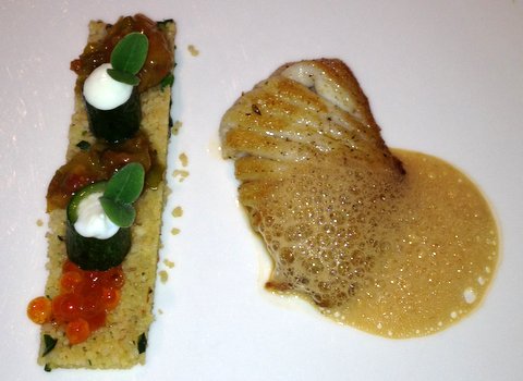 Butter-fried ray with couscous, salmon roe, mango chutney and zucchini stuffed with yogurt. The ray was very flavorful and cooked just right, very juicy and flaky, and paired well with the other stuff on the plate. The wine was a very good falanghina from Molise, made in barrels rather than steel tanks like most falanghina, and thus more round. The pairing with the ray was out of this world, and more than adequate with the (difficult) mango-curry chutney. 9/10